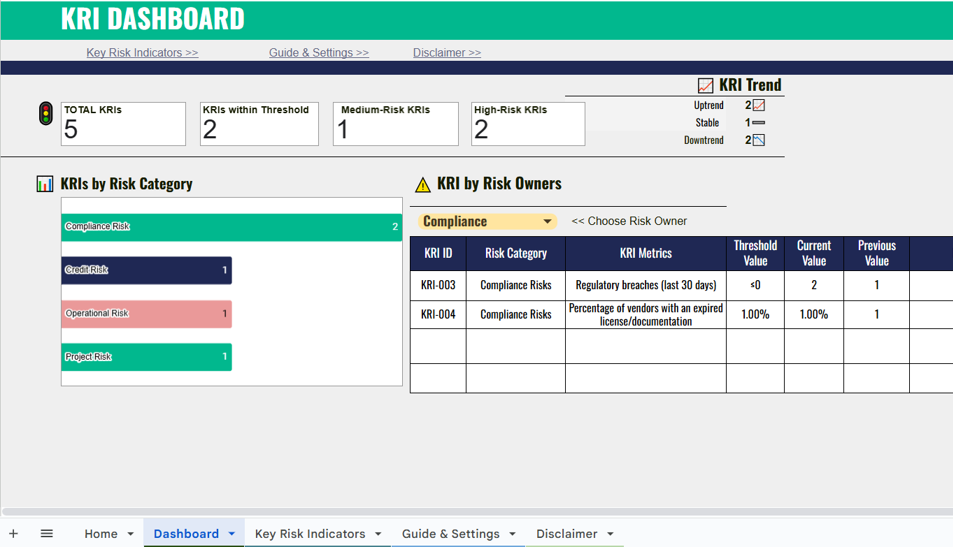 | 📊 Key Risk Indicator Dashboard (KRI) | Ongoing risk tracking | KRIs, thresholds, alerts | Trend dashboards | ⭐ ⭐ ⭐ ⭐ (High) |