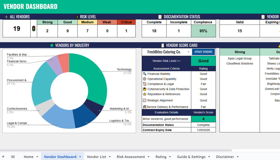 | 🏆 Vendor Risk Assessment & Score Card Tracker | Evaluating suppliers/vendors | Weighted scoring, category ratings | Vendor scorecards, export | ⭐ ⭐ ⭐ (Medium) |