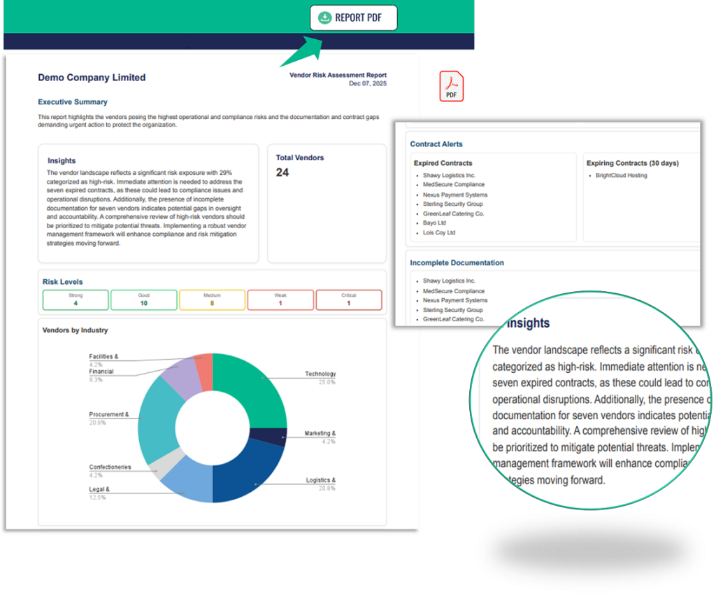 Highlights high-risk vendors and flags areas requiring immediate attention.